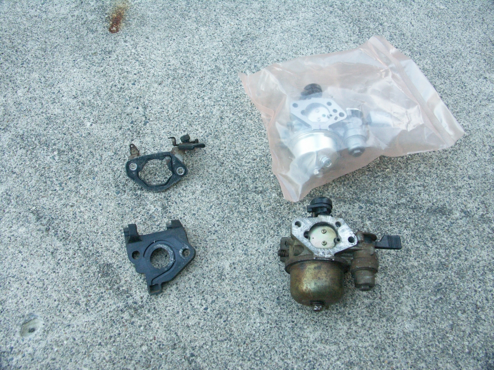 写真は、新品と外したキャブレター、インシュレーター等です。インシュレーター、なぜかクラックが入っている。以前の整備で締めすぎたのかな?