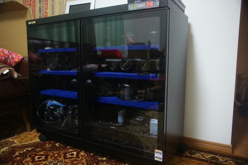 これまで、湿度を一定に保ち、防カビに効果があるといわれていた壁材による、収納庫にカメラ類を格納し、重要なレンズについては、ドライボックスに保管していましたが、やはり初夏には収納庫の湿度は危険ゾーンであり、ドライボックスも管理が十分にできないことから、防湿庫を検討してきました。今後、子どもたちが大きくなり、いたずらの範囲も広がることが予想され、カギがかけられる点も重要です。