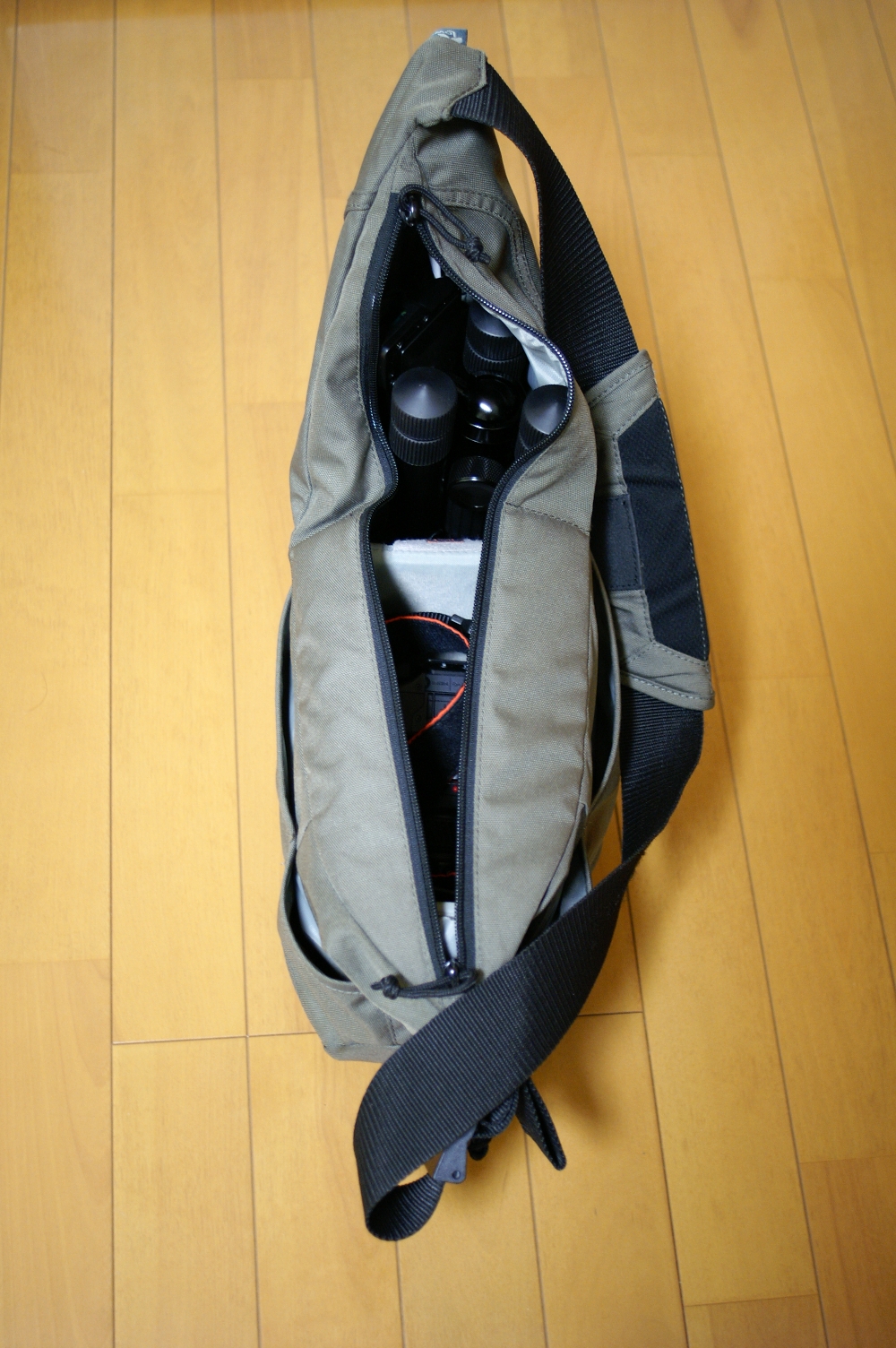 通常状態で入ることが確認できたため(そんなに窮屈ではないと感じます)、購入してきました。写真は、UT-63Qと、A700、A17-35Gが入っている状態です。通常状態では、これ以外は何か入れることは困難ですが、チャックを開けばその他の持ち物も入ります。こわれものはUT-63Qと同居すると破壊されると思われるので要注意ですが…。