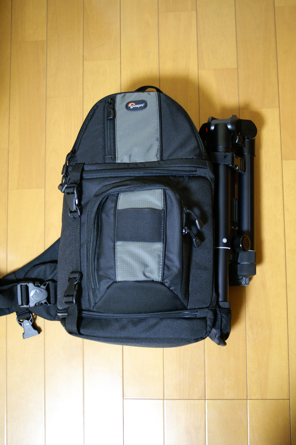 通常の収納状態では短すぎて固定がうまくできません。足を展開して、エレベータ軸部での固定をしてみましたが、三脚が上に動いて下のポケットから抜ける可能性、雲台部分を他の人にぶつけて怪我をさせる可能性がある点が気になります。スリップロックのループ部に足を一本挿すのはどうかと思い試してみましたが、足が太いことが災いし、ぎりぎりです(石突ゴムが磨り減りそうです)。収納状態からエレベーターを伸ばし、雲台部をポケットに突っ込む方法も試しましたが、雲台部が簡単に抜けすぎることが気になります。