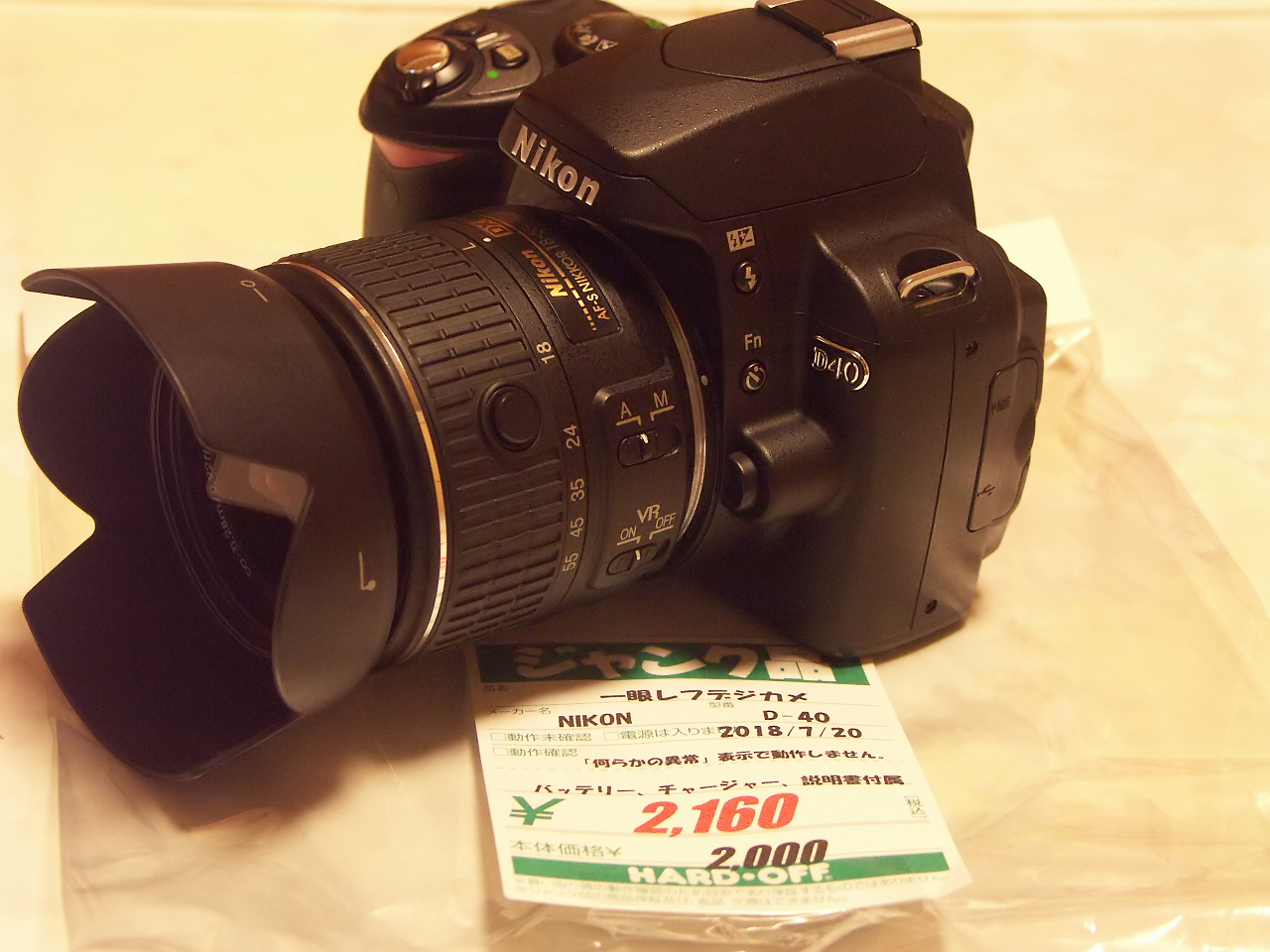 ジャンクの棚にあったD40。「なんらかの異常が発生しました」でシャッターが切れない状況です。しかし、外装が異様に綺麗なことから、思わず購入してしまいました。