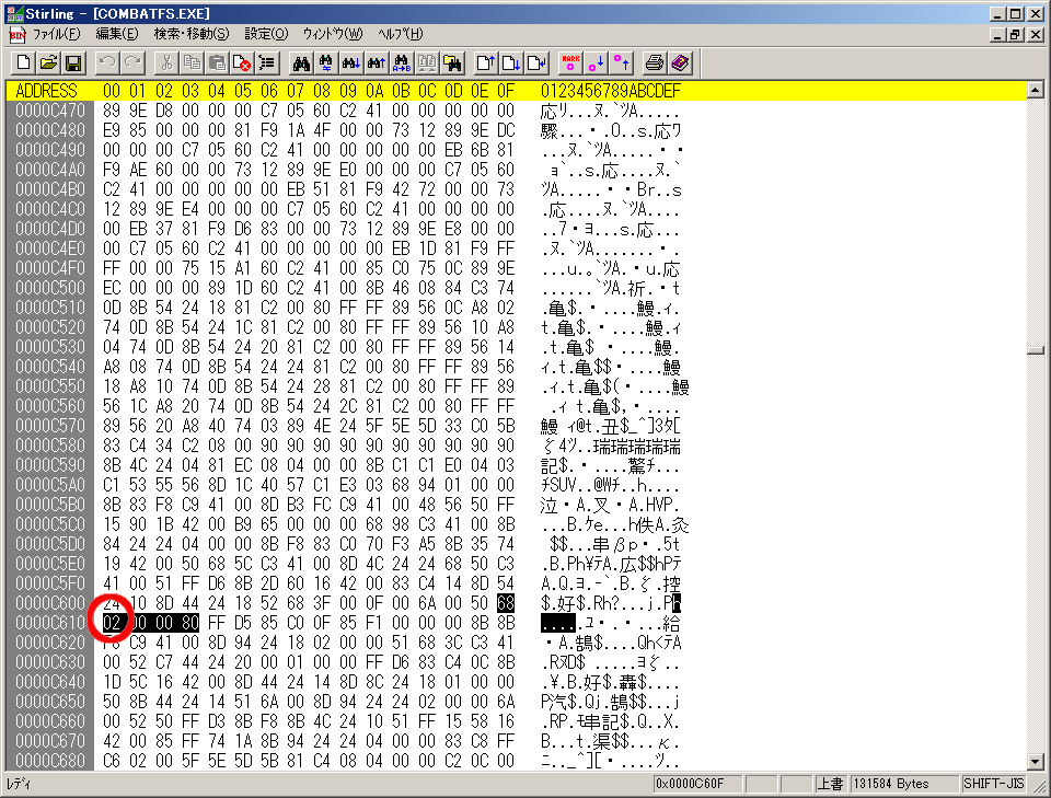 バイナリエディタでCombatFS.EXEを開き、6802000080(16進)を検索すると、私の場合、アドレス(ファイル先頭から)0x1141、0xC60F、0xC6BDに0x6802000080が発見されました。0x1141のものは書き換えないそうなので、0xC610の0x02を0x01に、0xC6BEの0x02を0x01に書き換えました。画像は、そのうちの0xC610です。