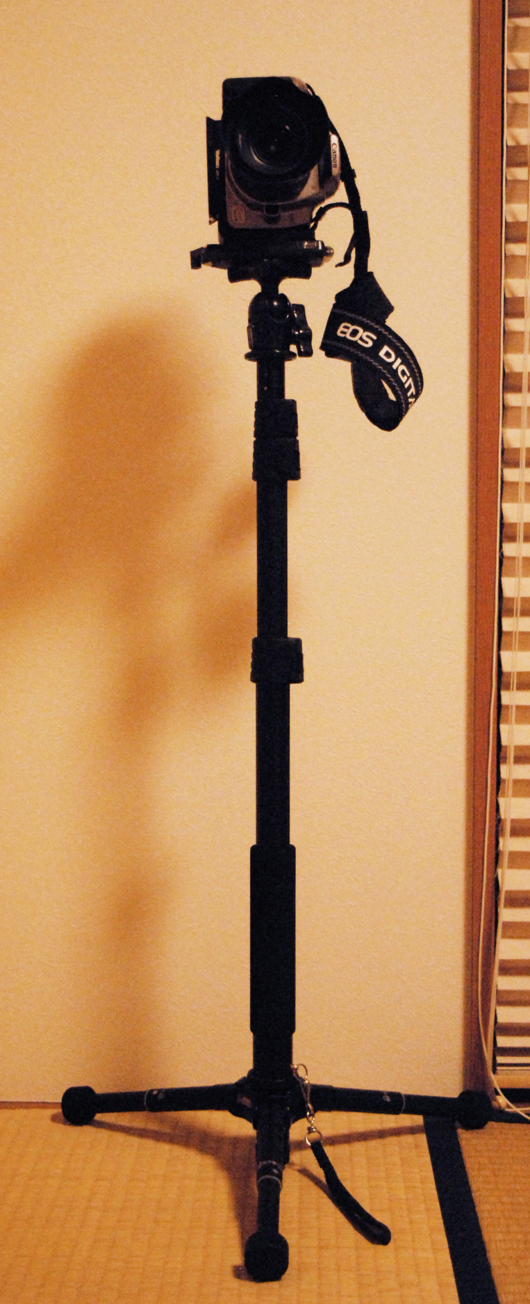 この向きであれば、一脚にしたくなっても、下部のミニ三脚を外してゴム石突に変えるだけ。SLIK方式であっても雲台を移動する必要がありますが、この方式なら雲台もそのままでよいので、モード変更もより迅速で、機動性があって便利そうです。私はこの運用にしてみようと思います。