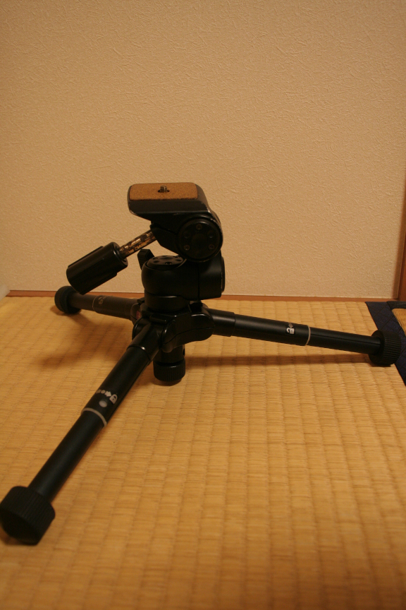 ウェッブページでは、脚部を他のベルボンのミニ三脚(ULTRA353miniなど)に変えている例があります。確かにULTRAminiQよりも足を伸ばせるミニ三脚ならばさらに安定するのでしょう。しかし、ミニ三脚は足が細いので、足がしなってグラグラしそう。きっと根本解決にはならない?
