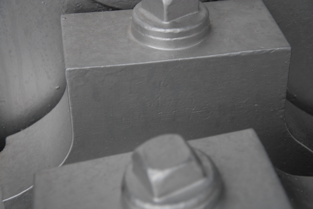 小さ目の文字で、「D51 921」と打ってある下側に、やや大きい文字で「D51 173」と打ってあり、二重取り消し線(もしくは三重取り消し線)で抹消してあるように見えます。173号機の部品を流用したのでしょうか?